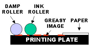 Lithography stamp printing consists of several processes. Firstly, the printing plate is attached to the printing press's cylinder. There are special dampening rollers which apply water, covering the blank portion of the plate. Hydrophobic ink is later applied to the ink rollers. It pushes the water away and adheres only to the emulsion of the image area.